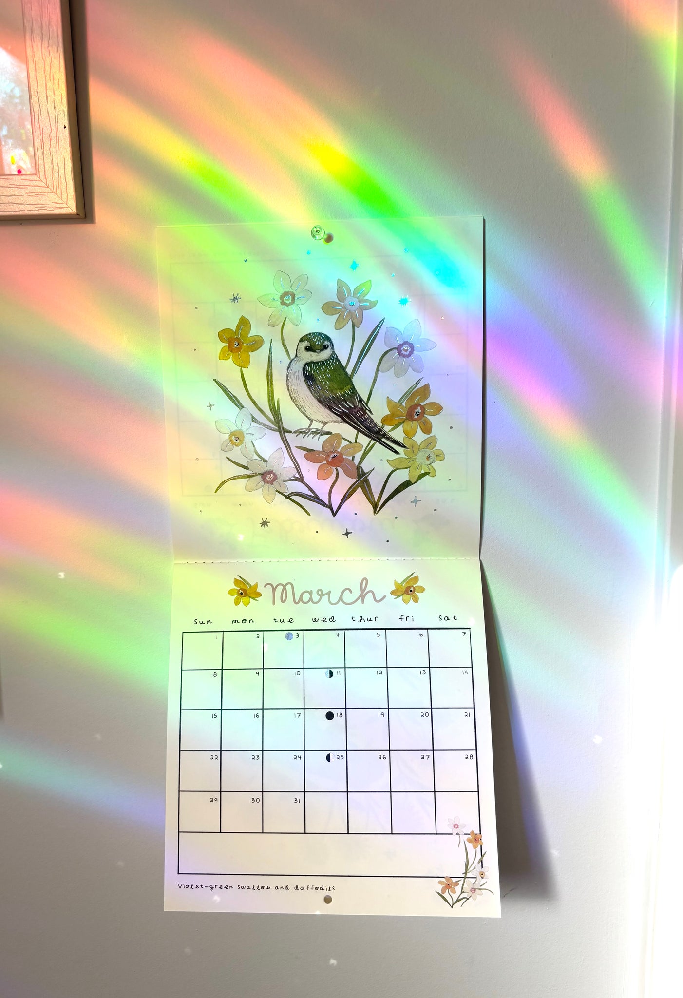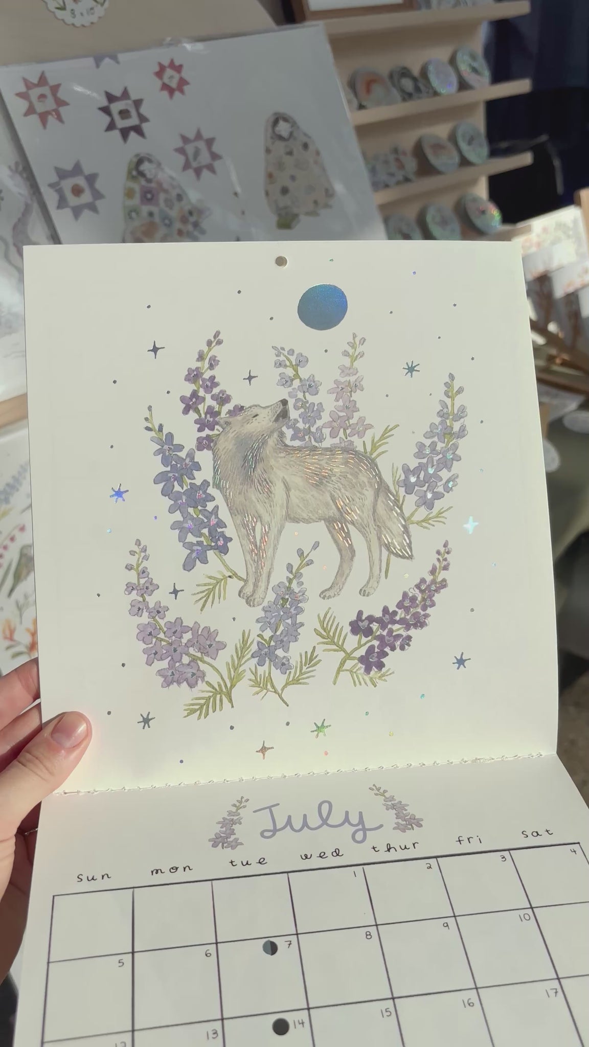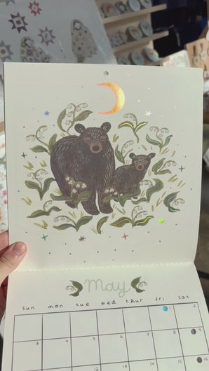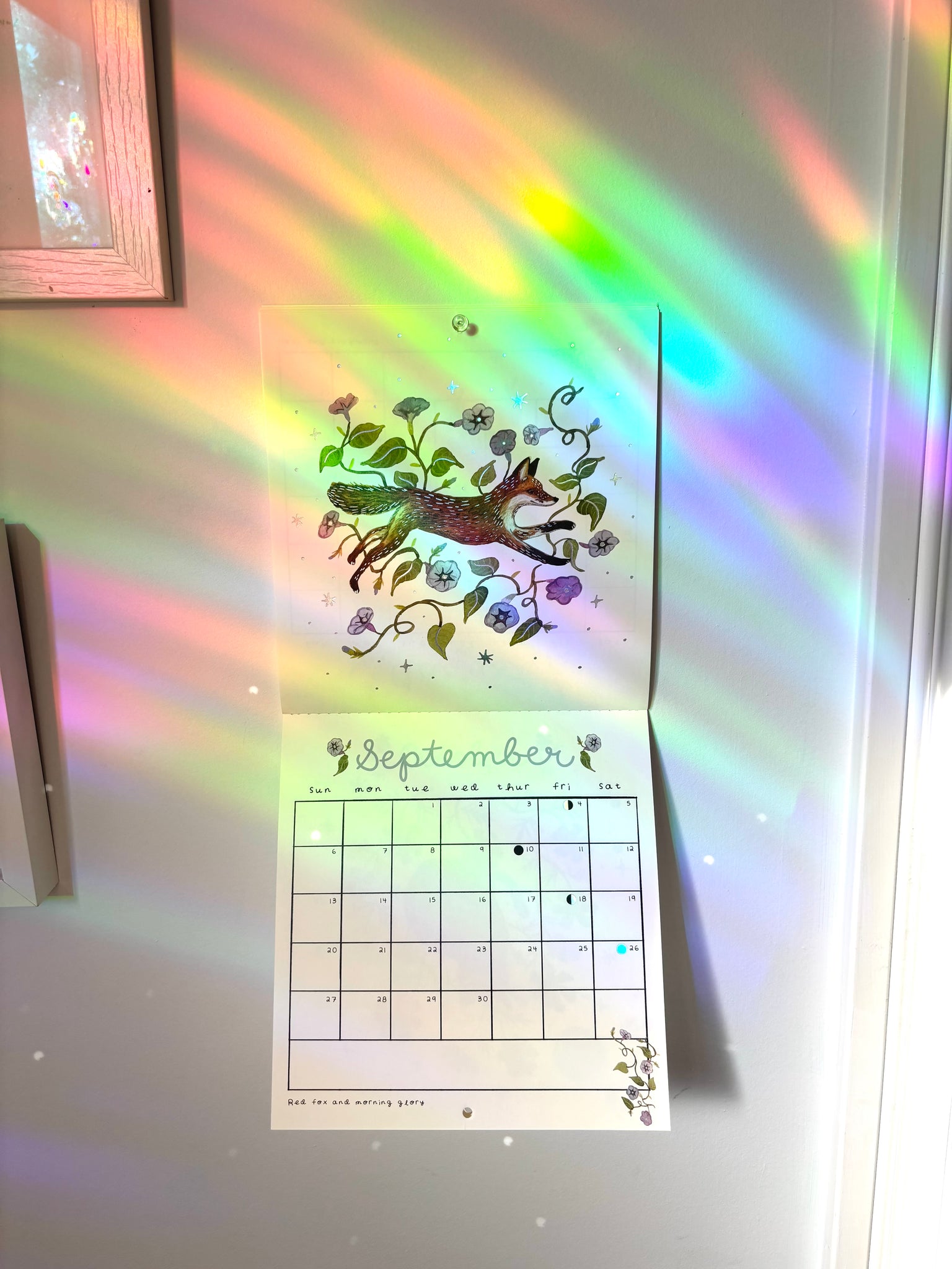 - The calendar has iridescent foil details on the animals and plants, and moons and stars surrounding them.