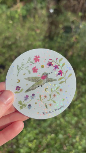 Anna's Hummingbird with cosmos, fuchsia, daisies, and pansies. Original artwork created with watercolour on paper by Emilie Nunez.