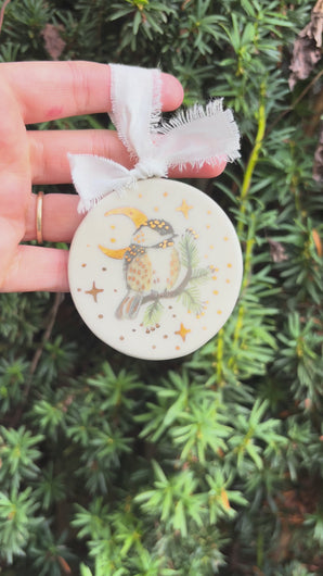 Handmade ceramic ornament. Hand built with a warm white clay and fired in the kiln four times. Original artwork by Emilie Nunez.