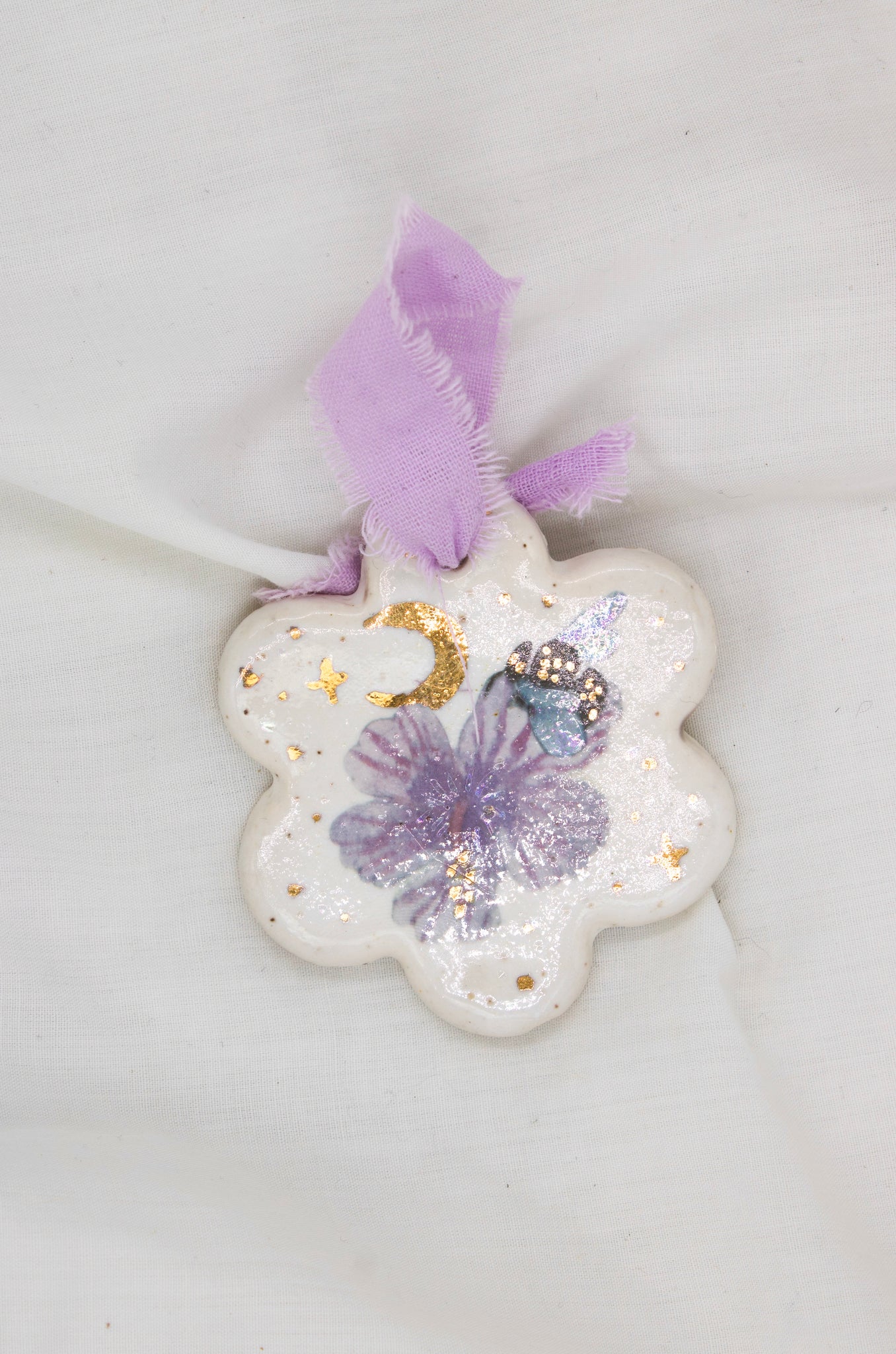 Handmade ceramic ornament. Hand built with a speckled warm white clay and fired in the kiln four times. Glazed with a glossy white glaze. Original artwork by Emilie Nunez.