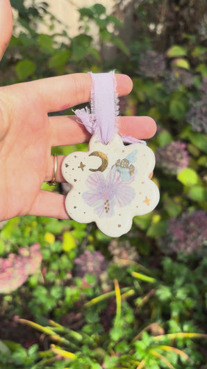 Original painting made with watercolour, and a print is transferred and fired onto the ornament. Hand embellished 22-karat gold lustre star and moon details.