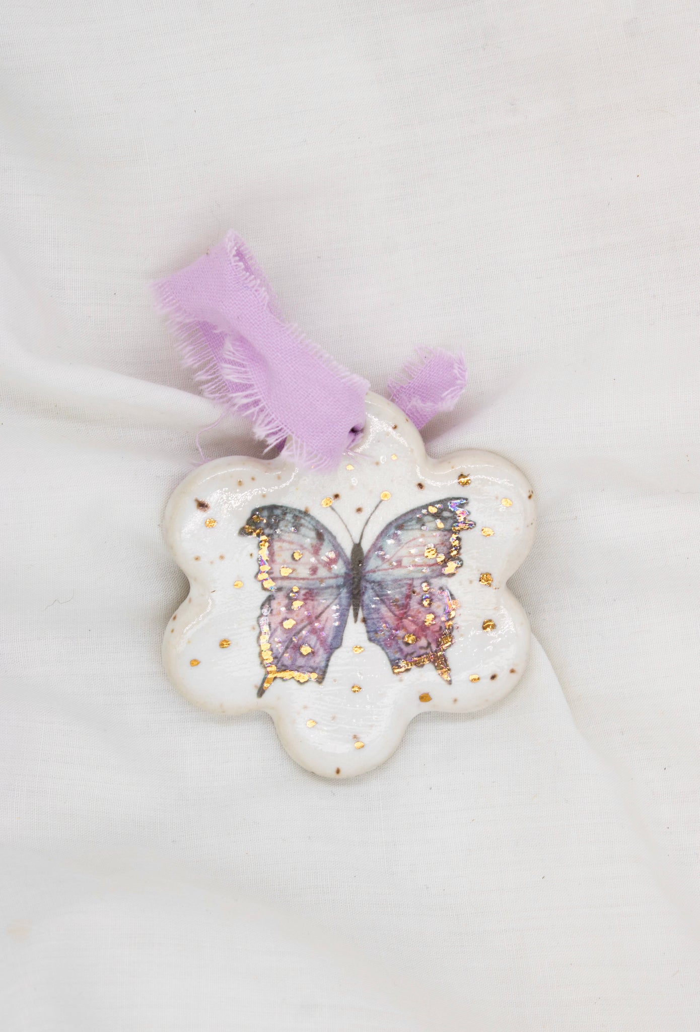 Handmade ceramic ornament. Hand built with a speckled warm white clay and fired in the kiln four times. Glazed with a glossy white glaze. Original artwork by Emilie Nunez.